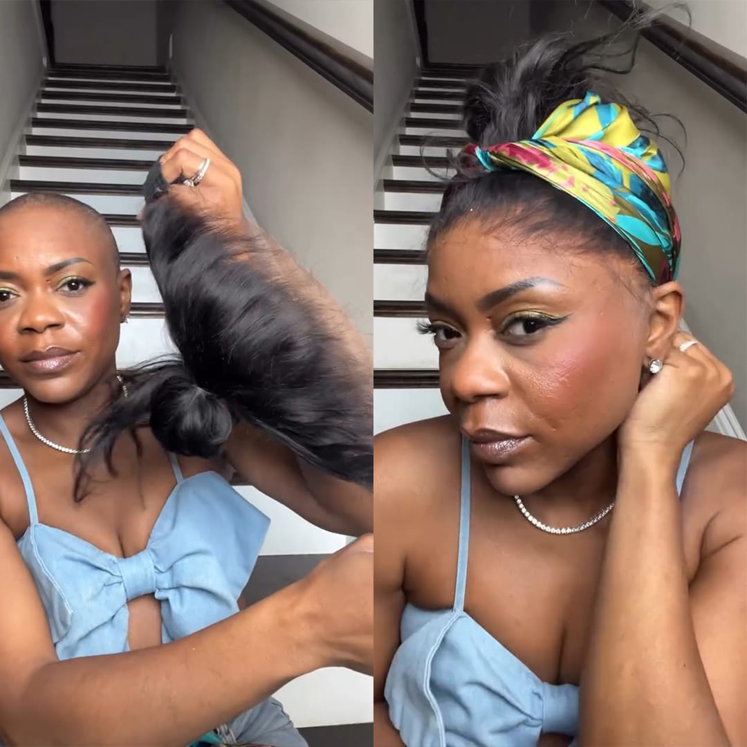 - Texture : Coiffure turban queue de cheval prête à porter, cheveux lisses brillants, installation en 1 minute